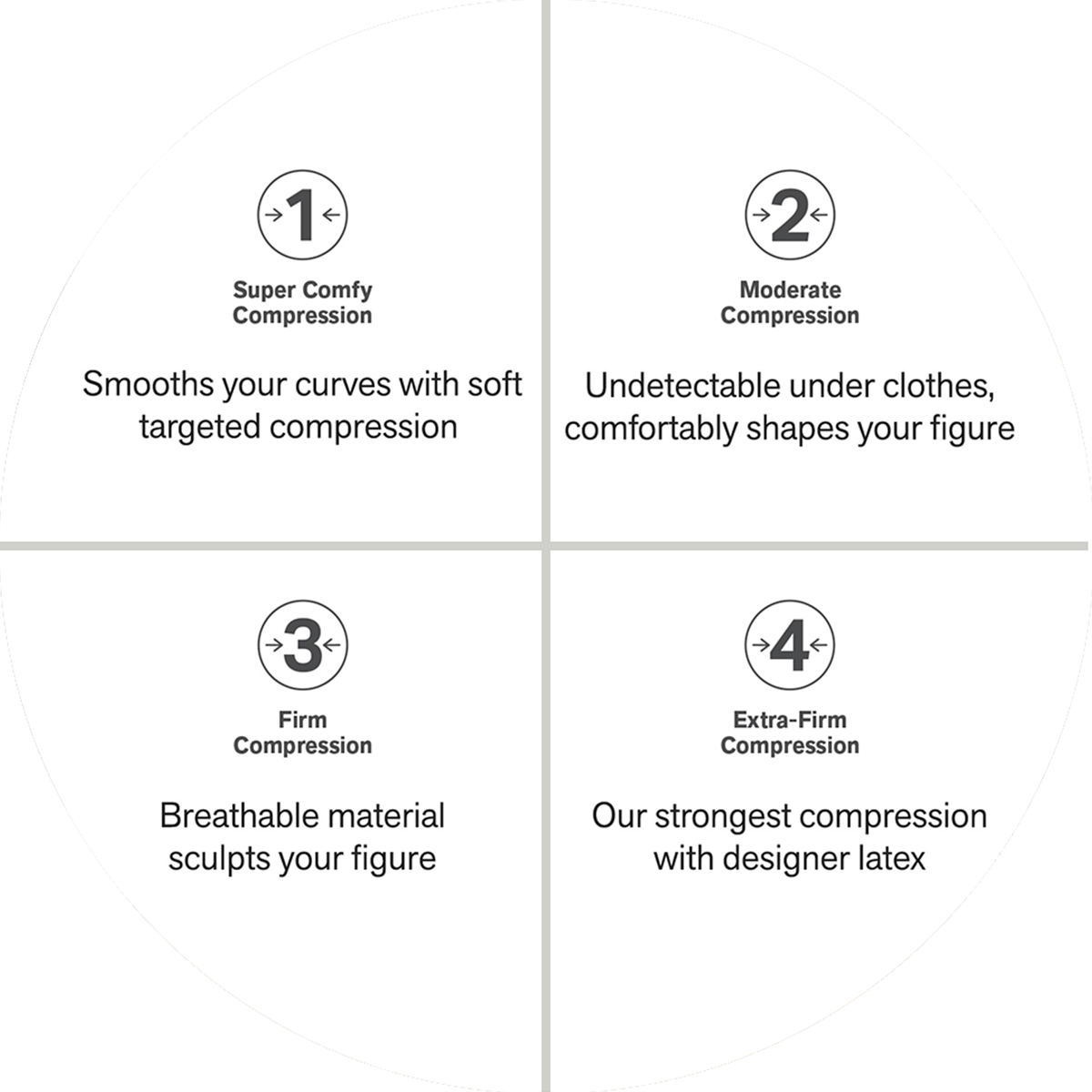 As nossas cintas cresceram para incluir 4 níveis de compressão: Suave, Moderada, Firme e Extra Firme. Há algo para toda a gente.